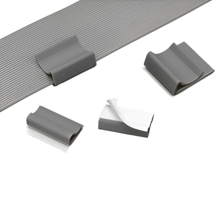 Selbstklebende Kabelclips für eine oder mehrere Lagen von Flachbandkabeln. Auch Schläuche können durch die flexible und angehobene Zunge leicht eingefädelt und montiert werden.