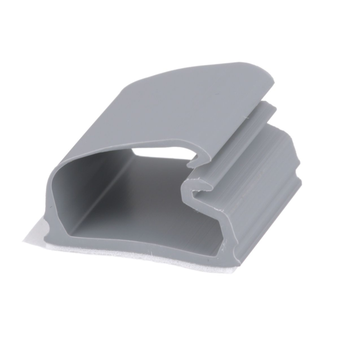 Einrastklemme als Kabelhalterung von dicken Kabeln, mit selbstklebender Rückseite für einfache Montage ohne Werkzeug